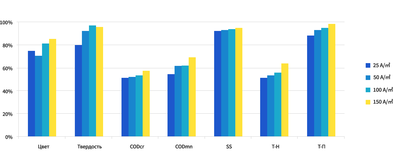 Фильтрат свалки промышленных отходов города K, фильтрат свалки города I, фильтрат промышленной свалки K в городе U. Используемые электроды: BDD (легированный бором алмазный) электрод