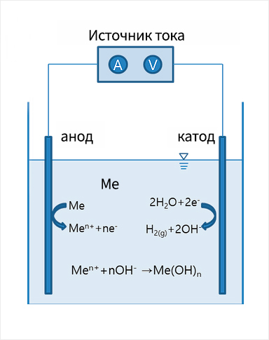 Процесс ЭХО включает в себя комплекс реакций электрохимического окисления-восстановления, электрохимической коагуляции и флокуляции, а также электрофлотации.