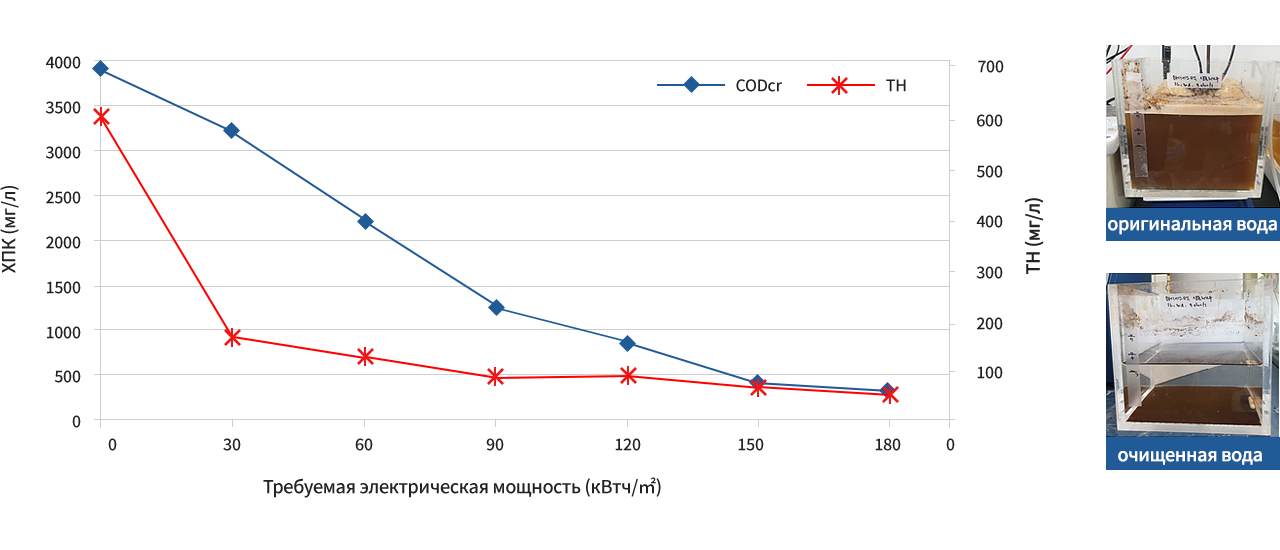 | (минута) | (мг/л) | Степень удаления | (мг/л) | Степень удаления | PtCo | Степень удаления | (кВт·ч/м3) |